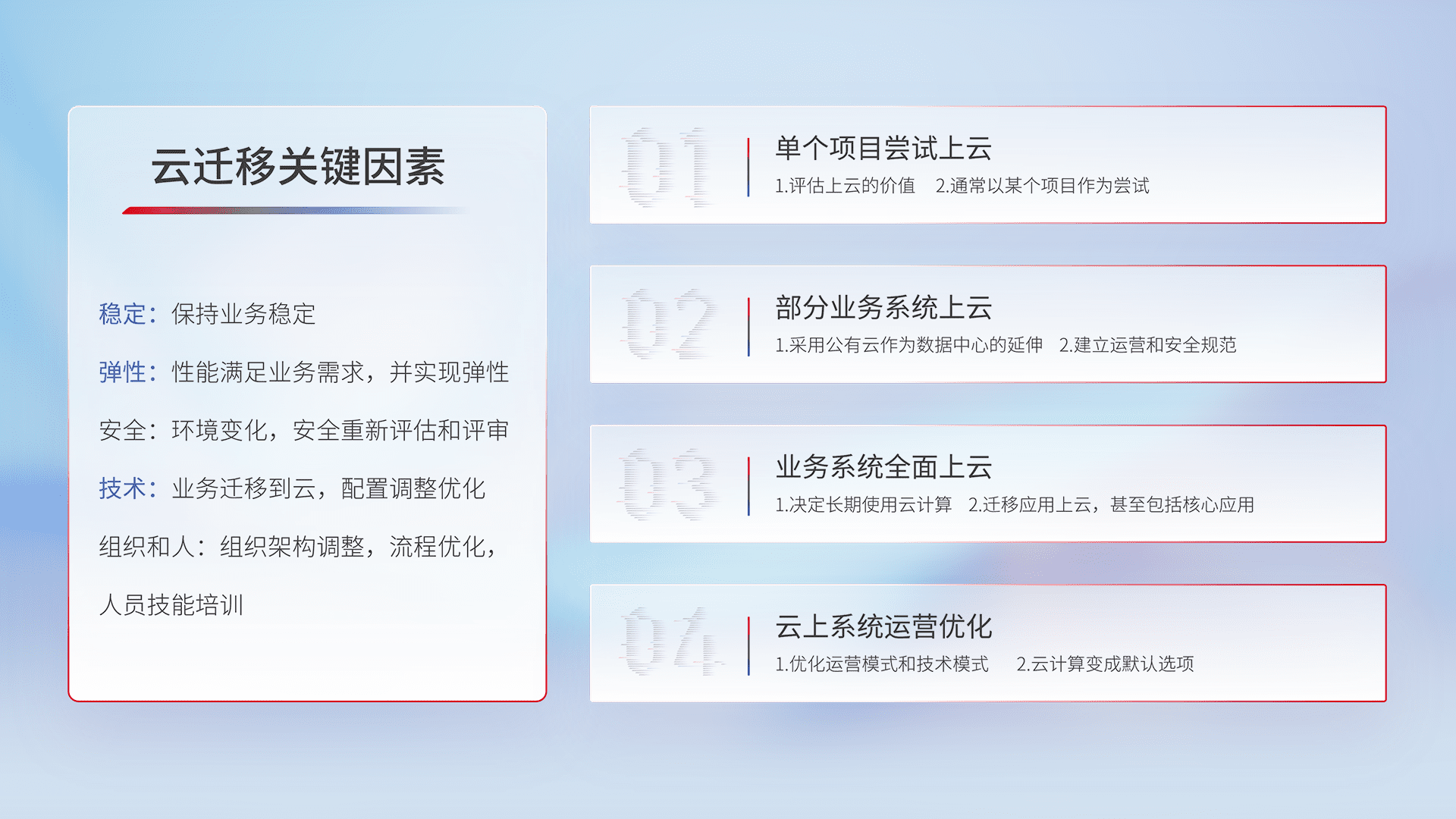 结合实际业务,,,,从规划设计、、、云平台选型、、、云原生改造、、数据迁移、、、、集成交付,,,迁移全过程为客户识别最佳上云路径,,,,做好风险识别管理,,,设计网络架构、、身份权限、、、安全审计合规、、操作审计、、、日志审计、、、监控告警策略、、、多站点容灾设计等,,,对云上基础设施进行整体规划,,,提升IT治理水平,,,,以满足弹性、、、、高可用、、、、高性能的需求。。。。