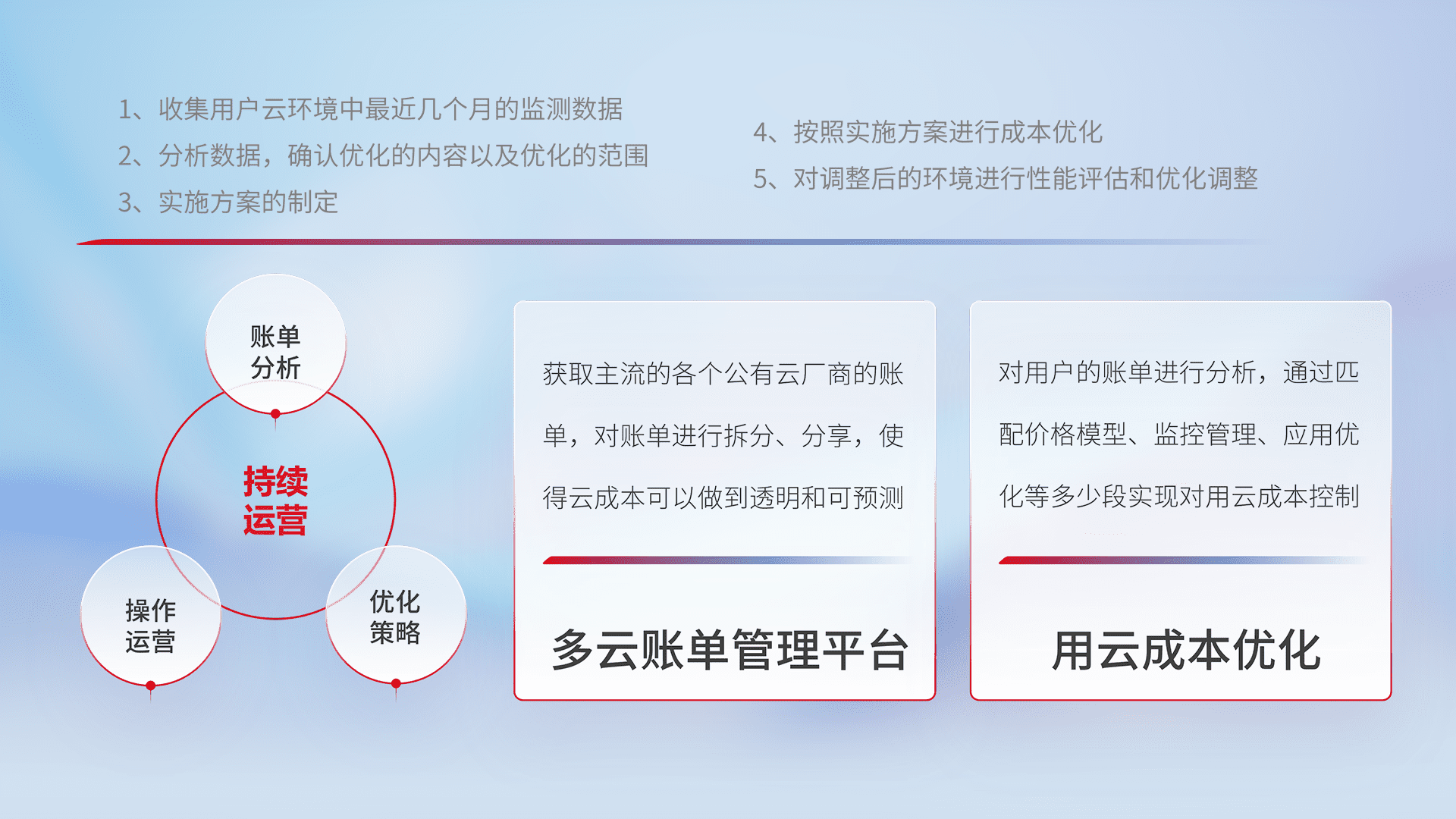 通过多云纳管,,,,以统一的资源数据模型把客户的云资源进行抽象和封装,,,进而实现对多云资源的统一操作,,保障云资源管理的可靠性、、、、稳定性与可用性。。。。量身定制化运维内容,,配置、、、、开发运维、、、、补丁管理、、备份、、监控、、、、认证和访问管理、、审计和日常巡检等,,,,保障在用云过程中的可靠度,,稳定度以及高可用率。。。