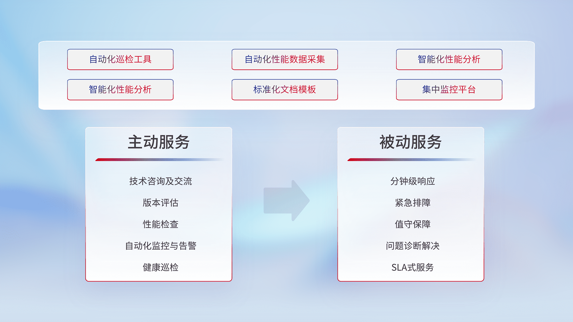 智能化工具和标准化文档,,,保障服务质量,,,,提供主动服务(包含技术咨询、、版本评估、、性能检查、、自动化监控与告警、、健康巡检)和被动服务包含(分钟级响应、、、、紧急排障、、、值守保障、、、问题诊断解决、、、、SLA服务)。。
